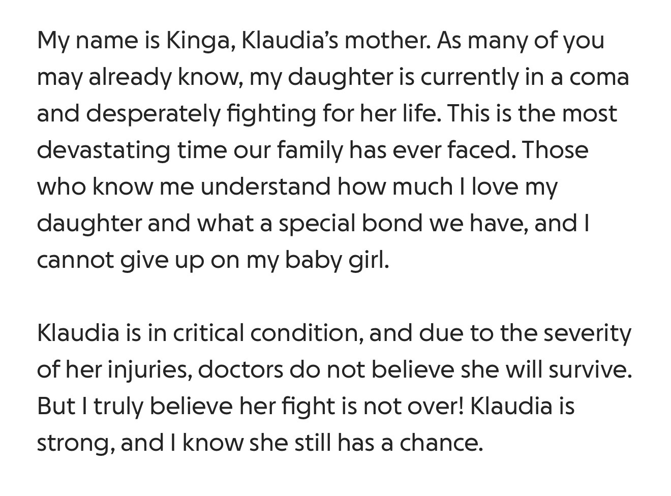 In the days leading up to her death, Klaudia’s mother, Kinga, shared a GoFundMe page, asking the public for financial and emotional support as the family navigated what she described as an incredibly difficult time. Messages of condolence and tributes have since poured in across social media, with many reflecting on Klaudia’s presence online and the sudden nature of the incident.