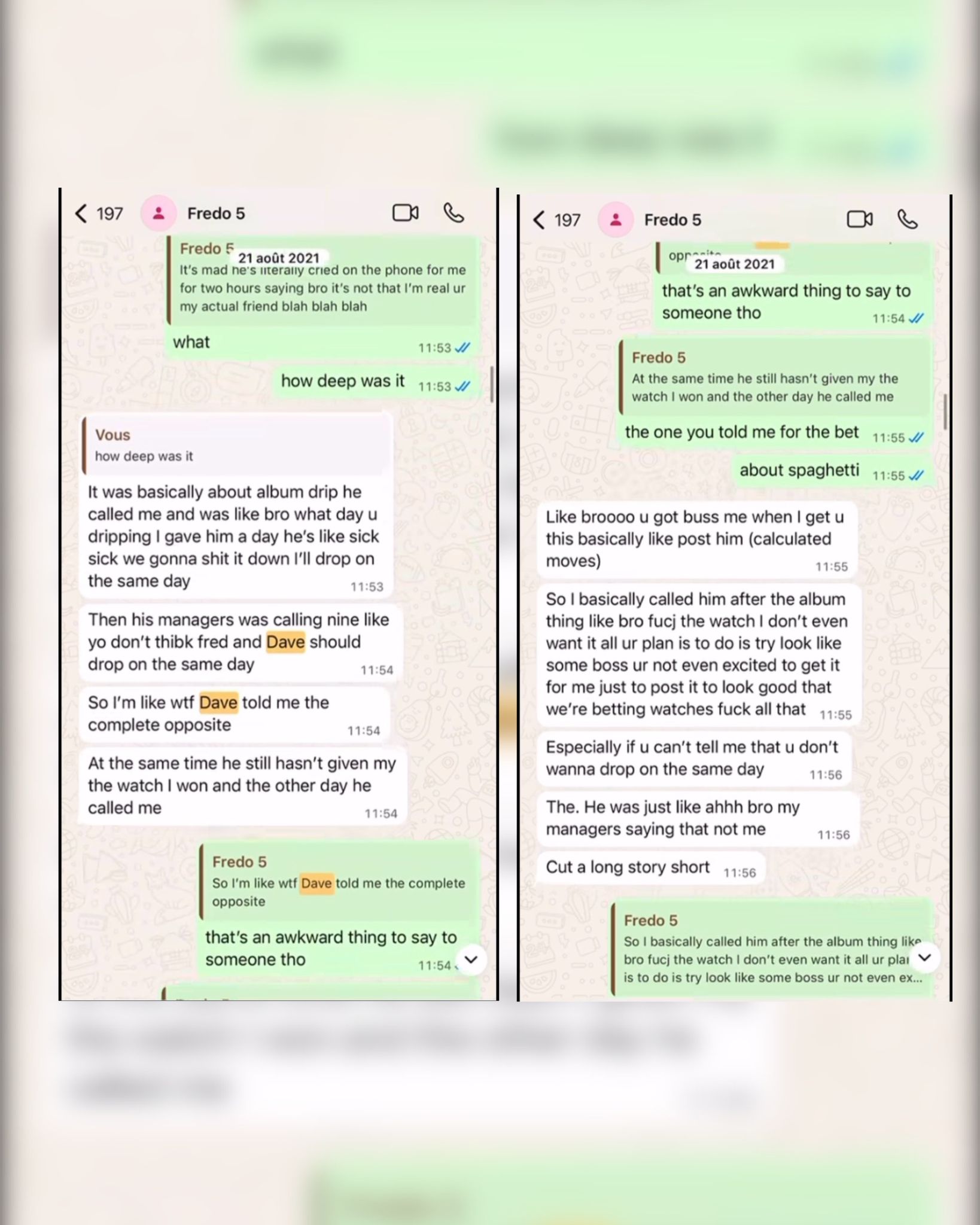 Insisting that Dave did not seem genuinely excited to give him the watch, but wanted it to appear like a fun public moment. The leaked chat also reveals Fredo’s irritation with what he felt was manipulation by Dave, avoiding blame and placing it on his managers. He points out that Dave never said outright he did not want to release an album on the same day, instead he left his managers to deliver the message. Fredo interprets this as avoidance and a lack of straightforwardness. In one voice note, he explains that Dave began calling around others to support his view, something Fredo felt made the situation “just looking long,” leading him to let it go.