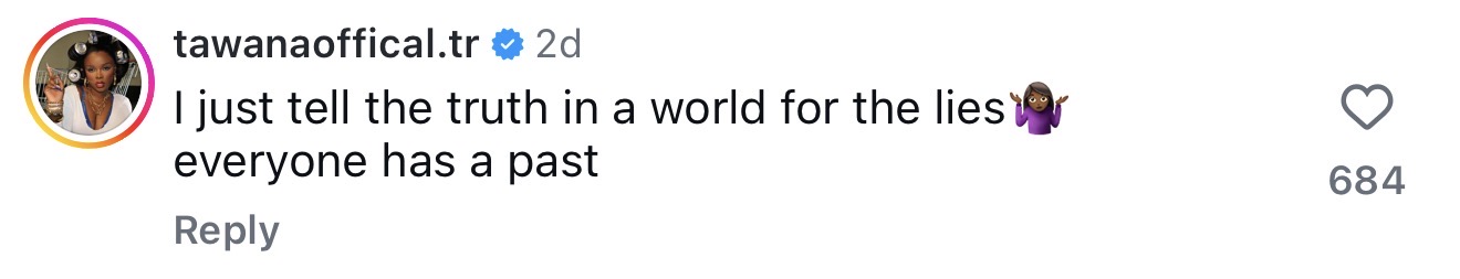In the clip shared on our platform, Tawana speaks openly about her past experience working as an escort. Rather than dodging the subject or dressing it up, she addresses it directly, framing it as a previous chapter of her life that she has since moved on from. Her message is rooted in ownership and reflection. She acknowledges her past, but also pushes back against the idea that it should define her entire identity. As she puts it in the comments: “I just tell the truth in a world full of lies. Everyone has a past.”