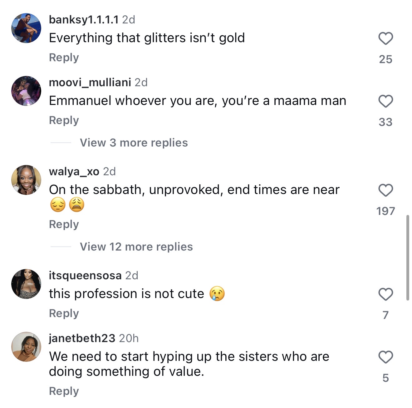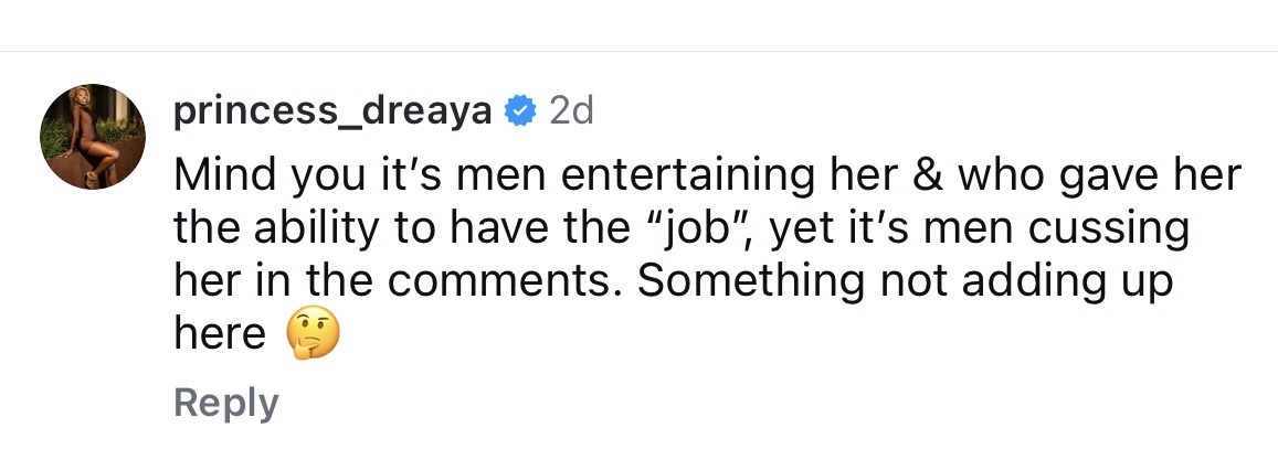 One widely engaged with response pointed out what many see as a contradiction in public judgement: “Mind you it’s men entertaining her… yet it’s men cussing her in the comments. Something not adding up here.” That sentiment taps into a recurring tension in these discussions, accountability versus participation, judgement versus consumption.